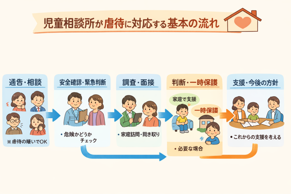 虐待対応のスタートは「通告」または「相談」です。